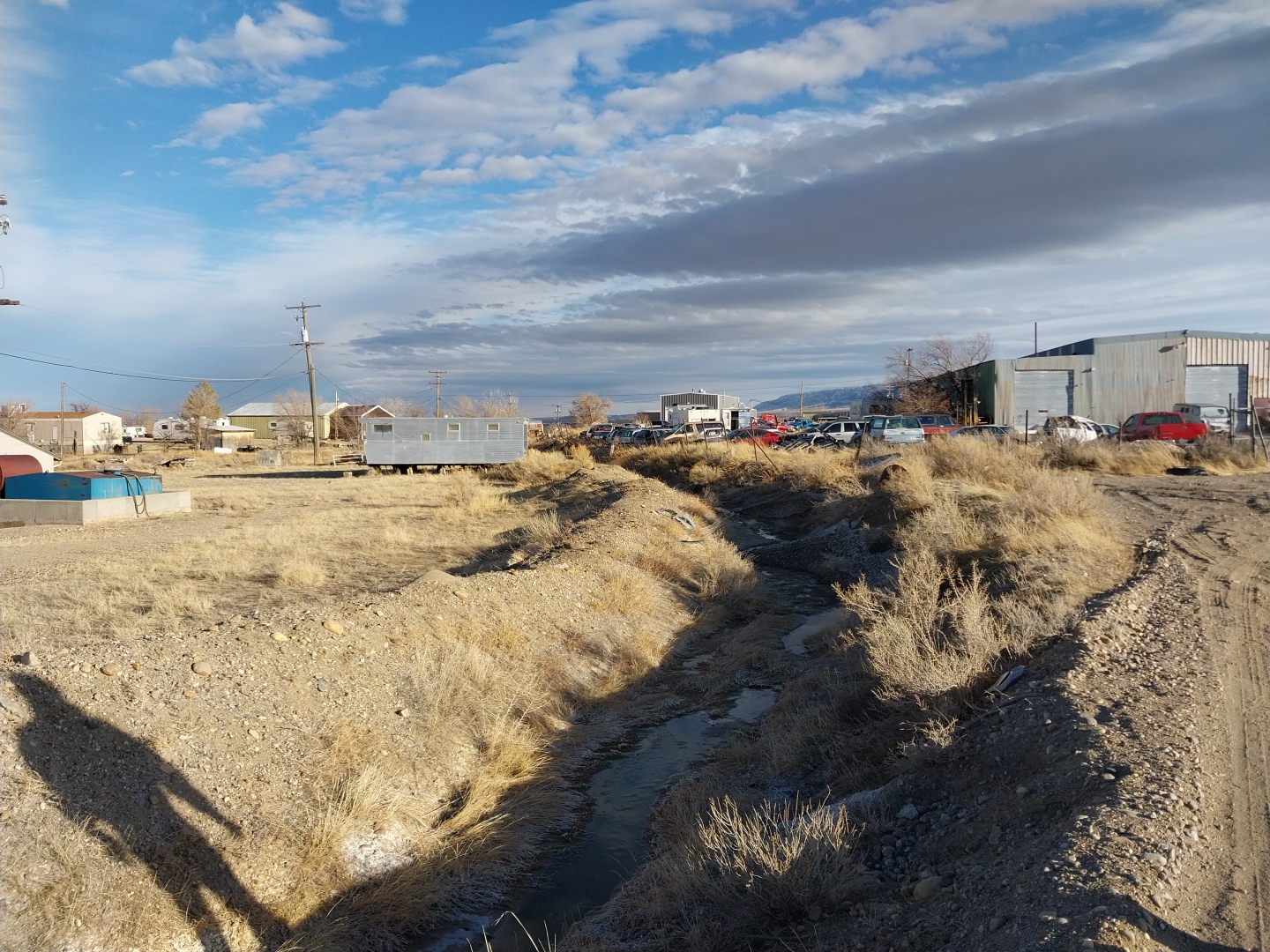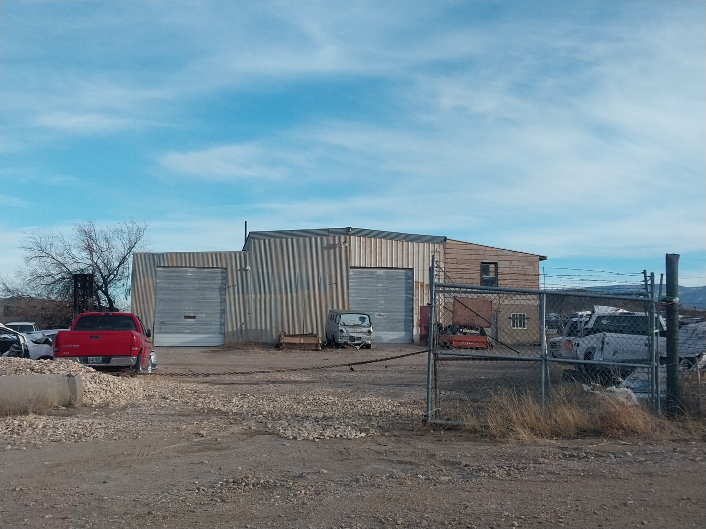 5.19 Acre of Heavy Industrial zoned land with two shops. First shop is 60’x100′ with 3 overhead doors and two level office area attached 18’x40′.